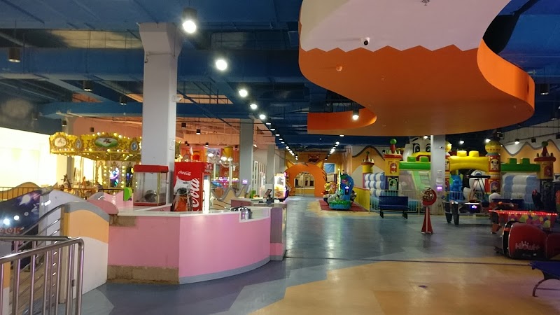 مركز تجاري بسيط بمجموعة متنوعة من متاجر تجزئة وسلاسل مطاعم وسوبرماركت وألعاب كلاسيكية وحديقة ترامبولين