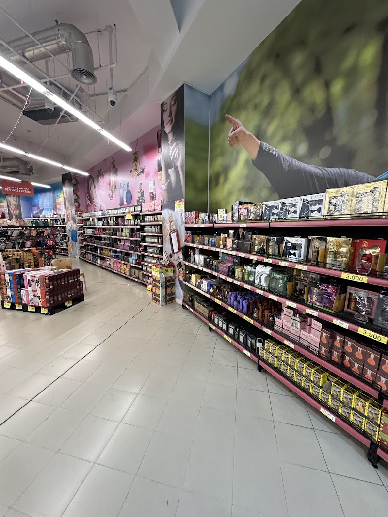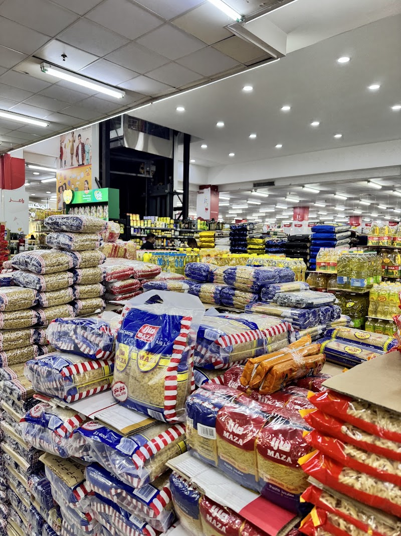 Small shopping plaza featuring a grocery items & a variety of low-cost household goods.
